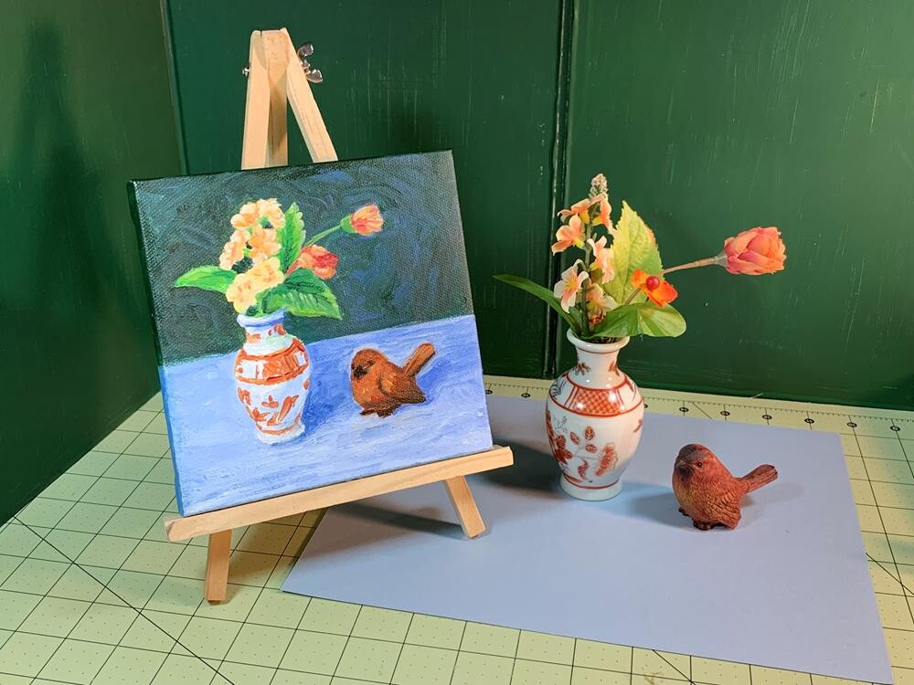 One in a series of still life paintings featuring little bird sculptures with floral arrangements. These are all miniatures. This is the second painting of the same still life set-up, which I did in watercolor and pen. To be transparent, I haven't had much experience painting with acrylics and want to develop that. To that accomplishment I am painting this next group of still life in both watercolor and acrylic. The results will be completely different. I love to stretch my abilities so this will be a fun and educational experience. I love to draw and enjoy drawing before painting to help me decide how I want the composition to look. I have some vases with an Asian design, and this is one of them. The leaves and flowers are fake, which gives me an infinite amount of time to try different arrangements and media ;-)) My intention for this series of small art is that they be cheerful, playful, and fun to look at. Watch the Video: https://youtu.be/DWP5LhTJkjU Be sure to watch the first video: Still Life with Asian Vase and Bird Figurine #1, where, In the last few minutes of the video, I present an analysis of my composition design using hidden shape overlay. I hope to be helpful for the art student interested in my ideas. Thank you for looking! One in a series of still life paintings featuring little bird sculptures with floral arrangements. These are all miniatures. This is the second painting of the same still life set-up, which I did in watercolor and pen. To be transparent, I haven't had much experience painting with acrylics and want to develop that. To that accomplishment I am painting this next group of still life in both watercolor and acrylic. The results will be completely different. I love to stretch my abilities so this will be a fun and educational experience. I love to draw and enjoy drawing before painting to help me decide how I want the composition to look. I have some vases with an Asian design, and this is one of them. The leaves and flowers are fake, which gives me an infinite amount of time to try different arrangements and media ;-)) My intention for this series of small art is that they be cheerful, playful, and fun to look at. Watch the Video: https://youtu.be/DWP5LhTJkjU Be sure to watch the first video: Still Life with Asian Vase and Bird Figurine #1, where, In the last few minutes of the video, I present an analysis of my composition design using hidden shape overlay. I hope to be helpful for the art student interested in my ideas. Thank you for looking! |