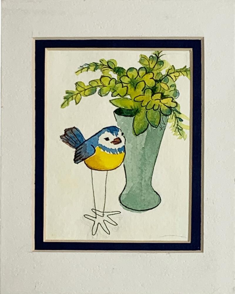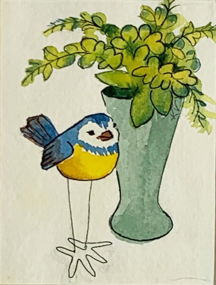 This piece is part of a series of little sculpture birds with flower vases. There are 3 of these wire-legged sculpture birds in a set, and this tall, leggy bird looks good with the tall vase. The greens in the vase and foliage are a mix of the yellow and blue paints used for the bird. This creates visual harmony and relationship between the elements. I've been collecting little bird sculptures to use in still life paintings. I also have a fun collection of florals that my sister-in-law creates. The 2 elements together are cute and fun to draw and paint. I use models as more of a guide, I don't replicate what I see exactly - artistic license you know. I am looking for a relationship between the elements. The foliage in the vase had something of an umbrella look to it, so that is what I focused on illustrating, which also creates a circular eye movement to always come back to seeing the bird as the most important element in the painting. I've been drawing all my life and enjoy it still. I especially like how ink drawing and watercolor look together, and you can see that in this painting. My intention with this series is to create fun, happy, playful art that I hope brings smiles to those who view them. This piece is part of a series of little sculpture birds with flower vases. There are 3 of these wire-legged sculpture birds in a set, and this tall, leggy bird looks good with the tall vase. The greens in the vase and foliage are a mix of the yellow and blue paints used for the bird. This creates visual harmony and relationship between the elements. I've been collecting little bird sculptures to use in still life paintings. I also have a fun collection of florals that my sister-in-law creates. The 2 elements together are cute and fun to draw and paint. I use models as more of a guide, I don't replicate what I see exactly - artistic license you know. I am looking for a relationship between the elements. The foliage in the vase had something of an umbrella look to it, so that is what I focused on illustrating, which also creates a circular eye movement to always come back to seeing the bird as the most important element in the painting. I've been drawing all my life and enjoy it still. I especially like how ink drawing and watercolor look together, and you can see that in this painting. My intention with this series is to create fun, happy, playful art that I hope brings smiles to those who view them. |