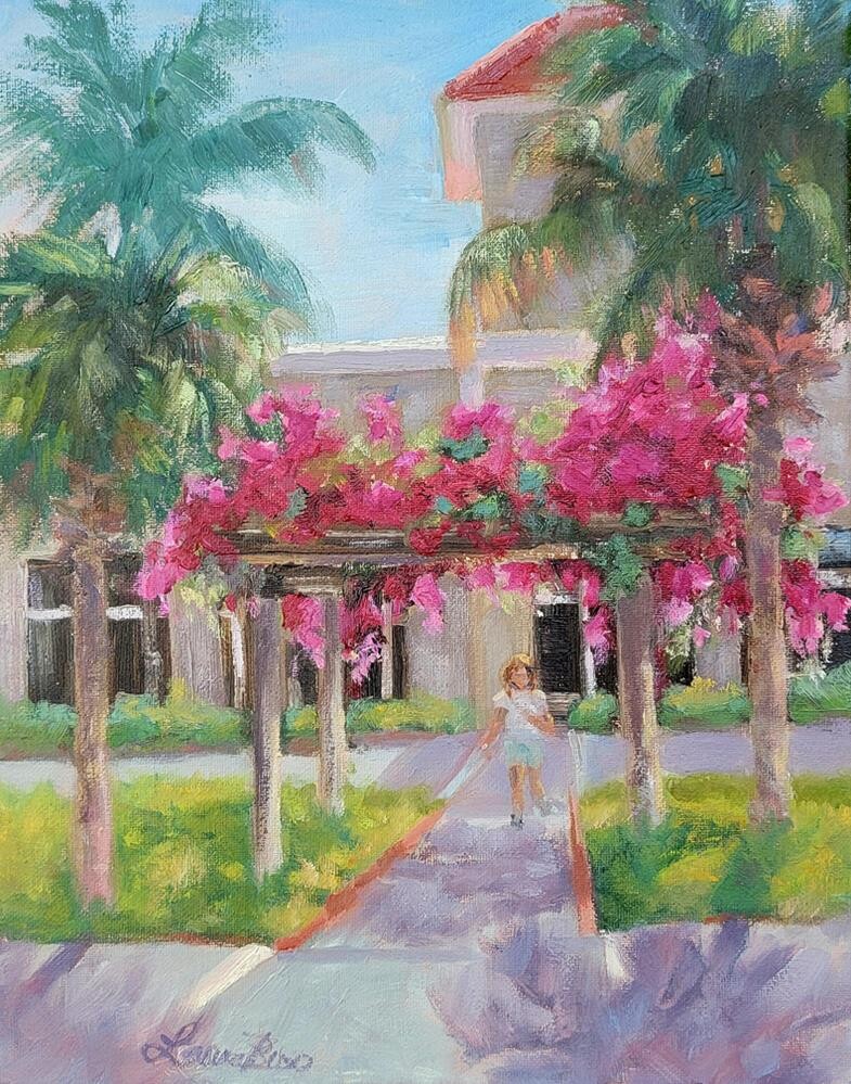 Plein air painting at the Shops at Vanderbuilt. The bright bougainvillea created a nice shady path for this lady.