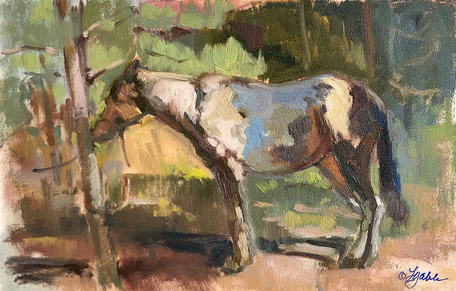 When I went on a pack trip into Oregon's Hell's Canyon, we rode sturdy horses and mules. There were also 3 mules that were laden with our gear. They all enjoyed the care and nurturing of the handlers on the days we stayed at camp. We enjoyed interacting with these strong and beautiful animals. Overnight and into the early morning, they were lightly tethered to small trees along the edge of the clearing -- holding still long enough so we could capture them in paint.