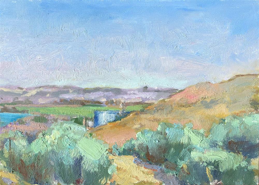 From a hilltop near the Flattop park in West Richland, Washington, I'm able to see afar to the north just beyond many agricultural fields to where the White Bluffs line the Columbia River. The skies hold dust particles from recent winds, creating a layer of lavendar atmosphere at the horizon line. This shrub steppe landscape is very arid and is especially pretty in the late summer when the sagebrush are abloom. Sagebrush bouquets with their twisted inner structures, are some of my favorite flora to paint. From a hilltop near the Flattop park in West Richland, Washington, I'm able to see afar to the north just beyond many agricultural fields to where the White Bluffs line the Columbia River. The skies hold dust particles from recent winds, creating a layer of lavendar atmosphere at the horizon line. This shrub steppe landscape is very arid and is especially pretty in the late summer when the sagebrush are abloom. Sagebrush bouquets with their twisted inner structures, are some of my favorite flora to paint. |