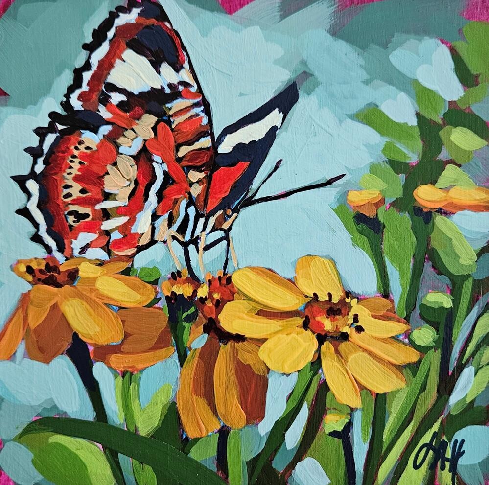 I didn't know what type of butterfly this was, but according to Google Lens, it's a leopard lacewing butterfly, so I'm going with that. Now to decide if the flowers are marigolds or zinnias? Acrylic paint on a 1.5" wide cradled wood panel. Sides are painted black. Painting and sides are finished with a satin varnish for added protection and an even sheen. Wired and ready to hang! I didn't know what type of butterfly this was, but according to Google Lens, it's a leopard lacewing butterfly, so I'm going with that. Now to decide if the flowers are marigolds or zinnias? Acrylic paint on a 1.5" wide cradled wood panel. Sides are painted black. Painting and sides are finished with a satin varnish for added protection and an even sheen. Wired and ready to hang! |