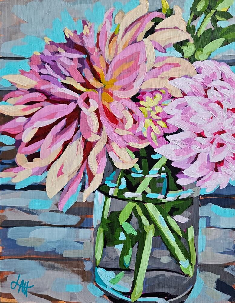 Dahlias are another one of my favorite flowers that I can't seem to grow! To me, there's nothing prettier than a simple mason jar full of colorful flowers. Acrylic paint on a 1.5" wide cradled wood panel. Sides are painted black. Painting and sides are finished with a satin varnish for added protection and an even sheen. Wired and ready to hang! Dahlias are another one of my favorite flowers that I can't seem to grow! To me, there's nothing prettier than a simple mason jar full of colorful flowers. Acrylic paint on a 1.5" wide cradled wood panel. Sides are painted black. Painting and sides are finished with a satin varnish for added protection and an even sheen. Wired and ready to hang! |