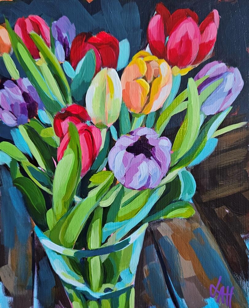 Some colorful tulips to celebrate the 2nd day of Spring! Acrylic paint on a 1.5" wide cradled wood panel. Sides are painted black. Painting and sides are finished with a satin varnish for added protection and an even sheen. Wired and ready to hang or sit on a shelf. Some colorful tulips to celebrate the 2nd day of Spring! Acrylic paint on a 1.5" wide cradled wood panel. Sides are painted black. Painting and sides are finished with a satin varnish for added protection and an even sheen. Wired and ready to hang or sit on a shelf. |