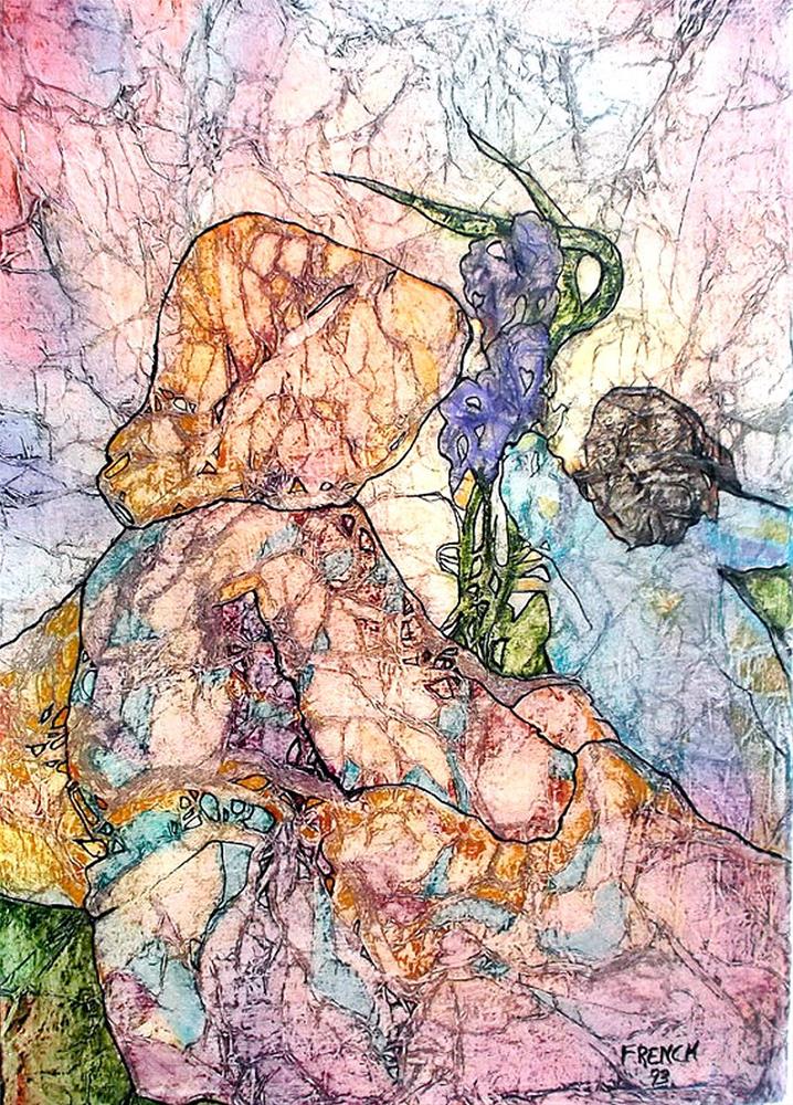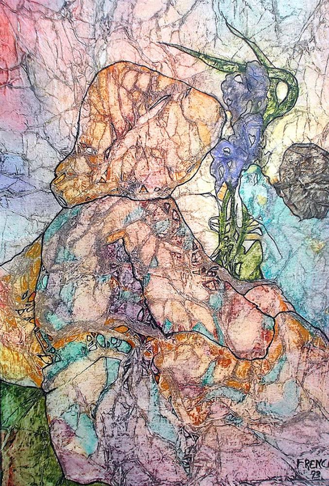 The detailed and textured painting has many glazes of color applied to achieve the luminous depth and hue to the colors. This technique was inspired by an ancient Zen meditation ritual in which the Buddhist monks would meditate on a crumpled, and then smoothed, sheet of rice paper until a vision appeared to them from the random lines and folds in the rice paper. For these paintings, I randomly apply crumpled tissue paper layers to a rigid backing. Then after many applications of transparent color washes, an image is suggested where the color has collected in the folds and swirls of the randomly applied tissue paper...kind of like finding images in the clouds. I continue to enhance and detail the image that has been suggested by the folds in the tissue paper by adding color in thin glazes, and definition with ink. The painting is then protected with a Broad Spectrum UV protectant, and light varnish. This signed painting measures 7 x 10 inches tall on prepared, archival, art board. The painting is not matted, and is not framed. Lynne French is a contemporary artist who trained at Chouinard Art Institute, CalArts, where she studied with both Millard Sheets and Phil Dike. She is collected throughout the United States in both private and public collections, has done extensive commercial work and numerous commission pieces. Lynne French is listed with AskArt, and also in The Artist's Bluebook. Please email all questions. All sales are final. Check out my other items & thanks for looking !