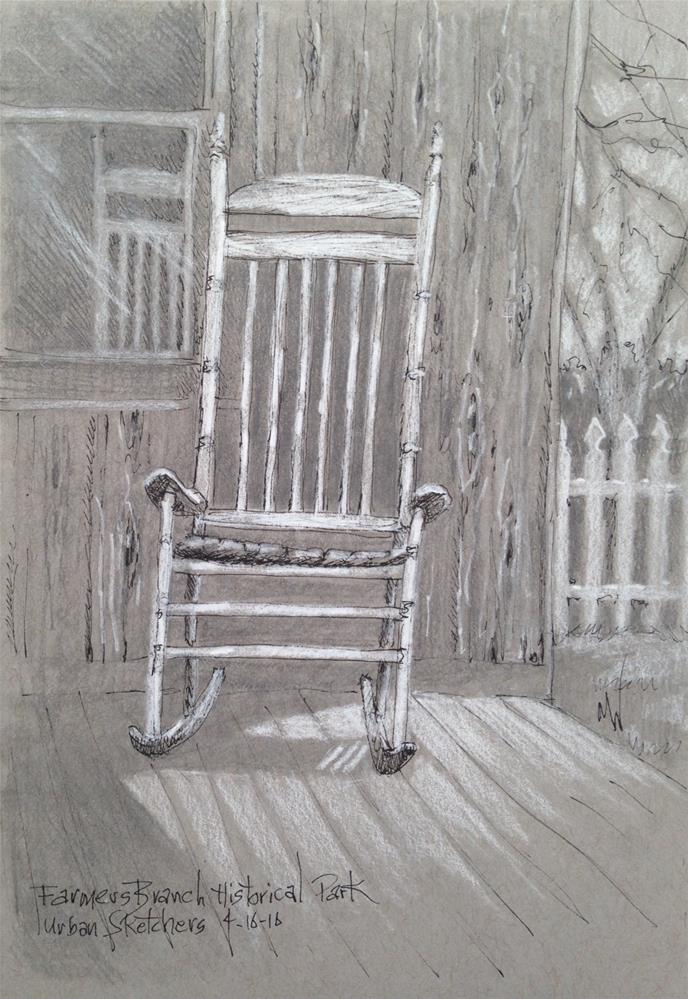 Drawing done on location at Farmer's Branch Historical Park, Texas. Urban Sketcher's of Fort Worth and Dallas, Texas met at the park where there were turn of the century buildings and houses. An old gas station and a general store were also included. The rocker was on the front porch of the General Store. Beautiful day to sit outside and sketch.