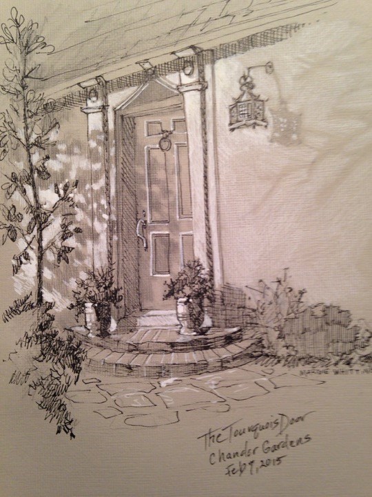 Drawing at Chandor Gardens in Weatherford, Tx. The weather was gorgeous. This started out as a pencil sketch then I added ink then highlights with an acrylic paint pen. I was drawing on grey paper.