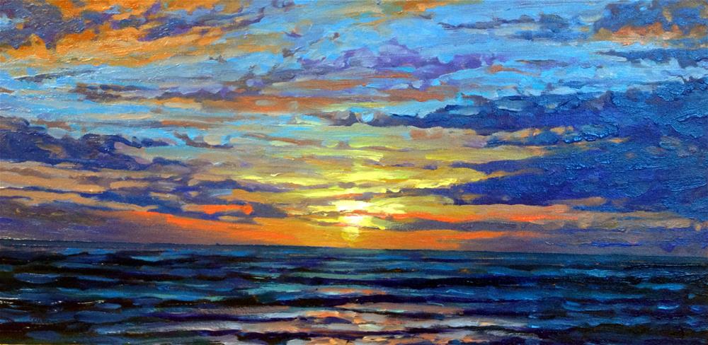 I never grow tired of the brilliant sunsets at the Gulf Coast. The blazing sky dancing on the waves leaves no separation of earth and sky. Everything is one through color.This 12" x 24" oil painting was recently part of my featured show as part of the Galveston Art Walk at Third Coast Gallery on the island. It's full of thick, juicy impasto brushstrokes and layers of lush color.