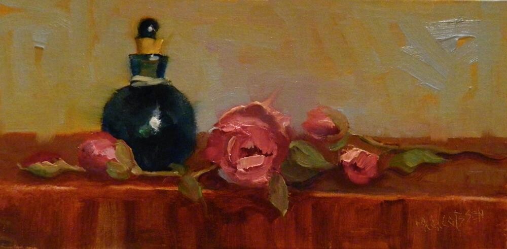 "On a Shelf", 6x12, oil on panel, roses, pink roses, gr...