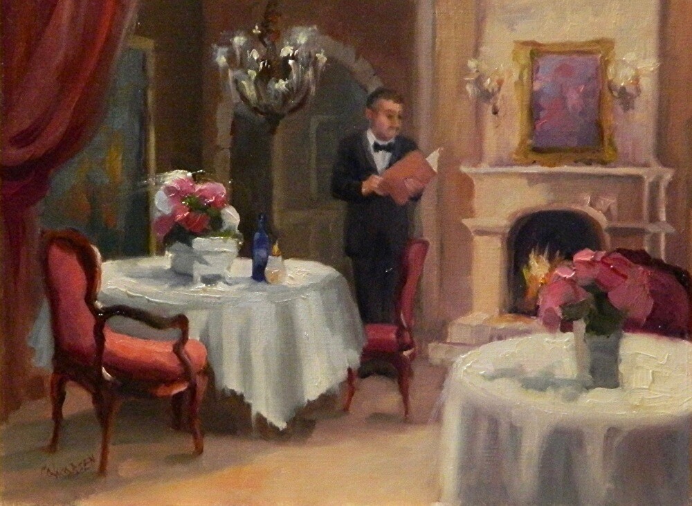I painted this romantic fire-lit room, because I personally love to dine in candlelight, seated in a velvet chair, and surrounded by old world charm. This painting is reduced 50% for a limited time only. Would make a lovely gift. I painted this romantic fire-lit room, because I personally love to dine in candlelight, seated in a velvet chair, and surrounded by old world charm. This painting is reduced 50% for a limited time only. Would make a lovely gift. |