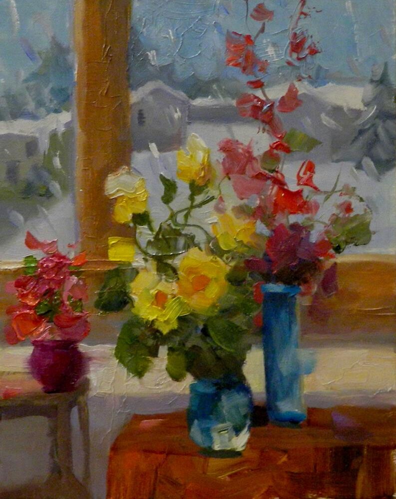 "Winter Cheer", 8x10, oil, winter, yellow roses, impres...