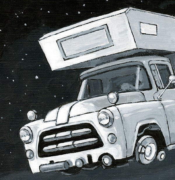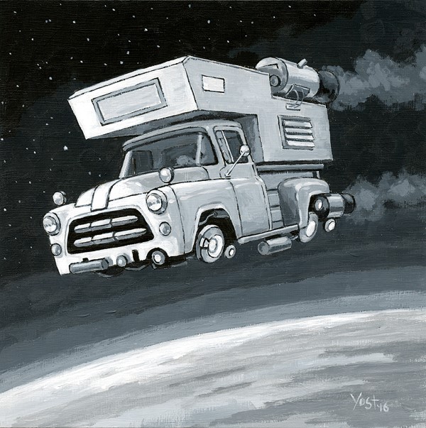 In the very early stages of the space program, engineers experimented with modified light trucks. It is rumored one or two prototypes still orbit the earth to this day. This little slice of revisionist history was painted in acrylic on a gessoed 8x8 sheet of Ampersand Hardbord. In the very early stages of the space program, engineers experimented with modified light trucks. It is rumored one or two prototypes still orbit the earth to this day. This little slice of revisionist history was painted in acrylic on a gessoed 8x8 sheet of Ampersand Hardbord. |