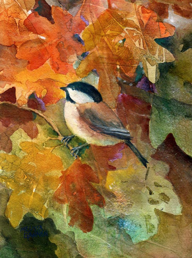 I'm exploring painting on hand made papers. This piece is painted on St Armand's wood grain textured paper. I started with acrylic inks, worked over that with watercolor and finished with a little opaque ink. There's some iridescent ink in the piece and some beautiful texture. I have also been painting with leaves, something I can't resist at this time of year. Hence the oak leaves.