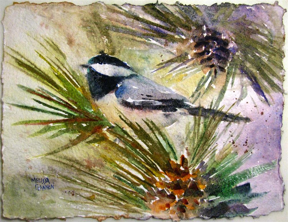 This chickadee is happily perched among the pine needles and pinecones!