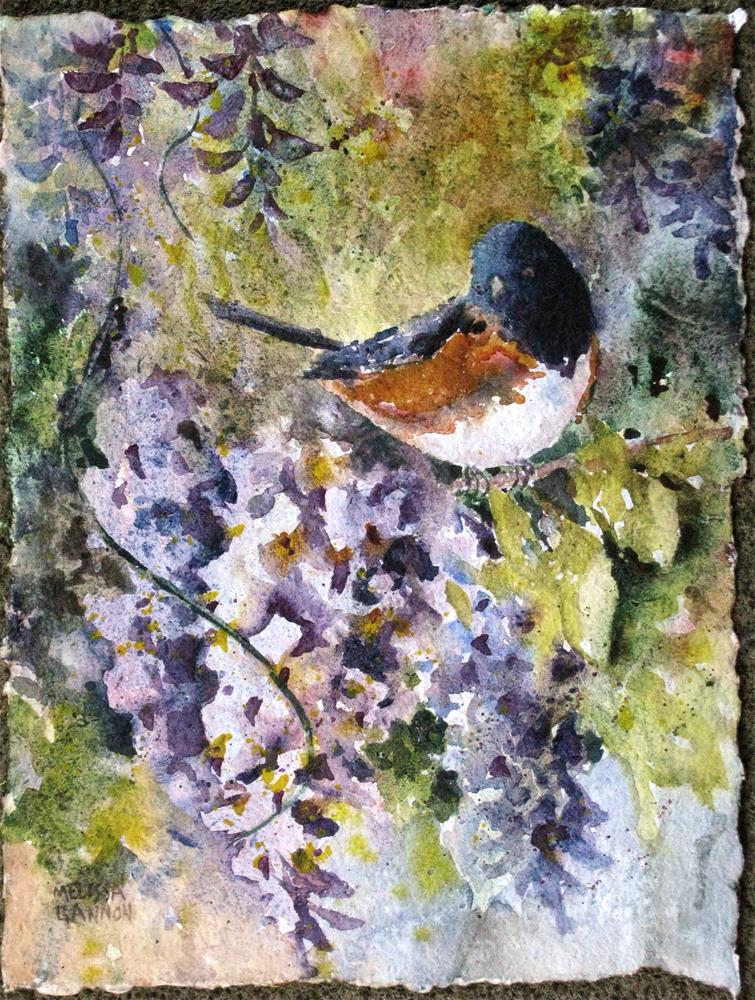 I was painting wisteria in my sister's yard and listening to the towhees sing. Why not combine them together in a painting? I really enjoyed the color combination of this piece.