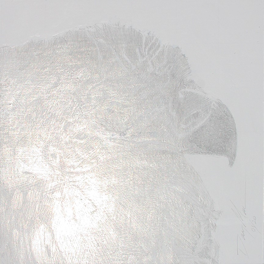 This is little Angel Cookie, forever 42 days old. A young bald eagle that died of exposure during a freezing rain and heavy snow in May, 2019. The artwork is done in "silverpoint," drawing the entire image with a small piece of sterling silver, in combination with a small piece of 14k gold, on a prepared surface. The silver will tarnish and darken some, but will still reflect light (glare of reflective property shown in the alternate photo, taken in bright sunlight). The pale layer of gold can be seen in both the non-reflected and reflected images. The gold will never tarnish. "Silverpoint," or "metalpoint," was used during the Renaissance. It's said to be the most difficult method of drawing (but in some ways I'm more comfortable with it; this is my 2nd work in silverpoint). This is little Angel Cookie, forever 42 days old. A young bald eagle that died of exposure during a freezing rain and heavy snow in May, 2019. The artwork is done in "silverpoint," drawing the entire image with a small piece of sterling silver, in combination with a small piece of 14k gold, on a prepared surface. The silver will tarnish and darken some, but will still reflect light (glare of reflective property shown in the alternate photo, taken in bright sunlight). The pale layer of gold can be seen in both the non-reflected and reflected images. The gold will never tarnish. "Silverpoint," or "metalpoint," was used during the Renaissance. It's said to be the most difficult method of drawing (but in some ways I'm more comfortable with it; this is my 2nd work in silverpoint). |
