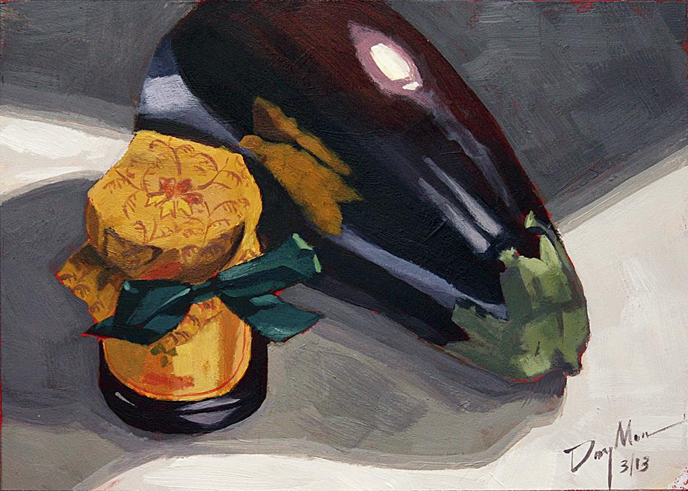 Eggplant, or aubergine as it is also known, is not my favorite veggie, unless it arrives on the table in the form of Indian baingan bharta! Then it's number one, right up there with saag paneer (which is, oddly, also number one). As it happens, I had baingan bharta the day I painted this; I remember, because I painted it to honor the owner of my favorite Indian restaurant who had signed up for my painting email list that day. Eggplant, or aubergine as it is also known, is not my favorite veggie, unless it arrives on the table in the form of Indian baingan bharta! Then it's number one, right up there with saag paneer (which is, oddly, also number one). As it happens, I had baingan bharta the day I painted this; I remember, because I painted it to honor the owner of my favorite Indian restaurant who had signed up for my painting email list that day. |
