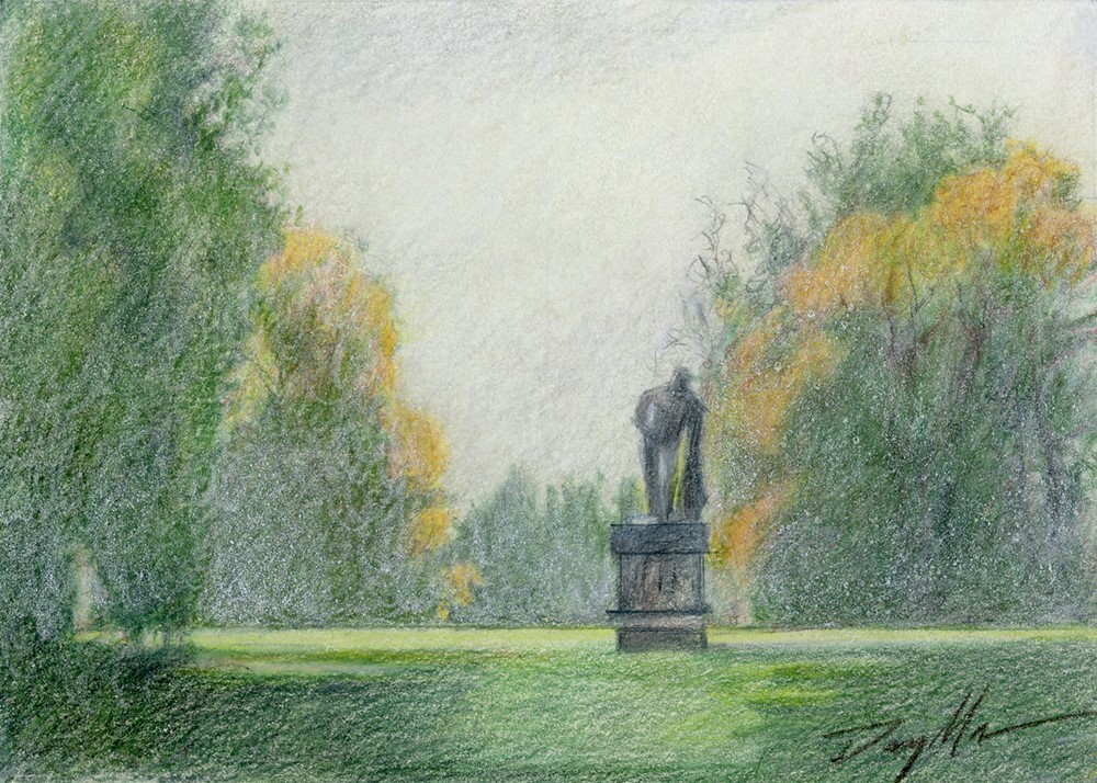I spent a fine morning at Vaux-le-Vicomte, the château of Nicolas Fouquet, Marquis de Belle Île, Viscount of Melun and Vaux. The great estate has magnificent gardens and statues. I was drawn to this statue, where a light early morning fog seemed to enhance the distance. This colored pencil sketch is a preliminary for a possible painting, and allowed me to explore the hues, soft morning light, and values of the view. As such, it is available for purchase at auction, flaws and all. The piece is 7" x 5", on paper mounted to a sturdy Letramax single-weight illustration board.