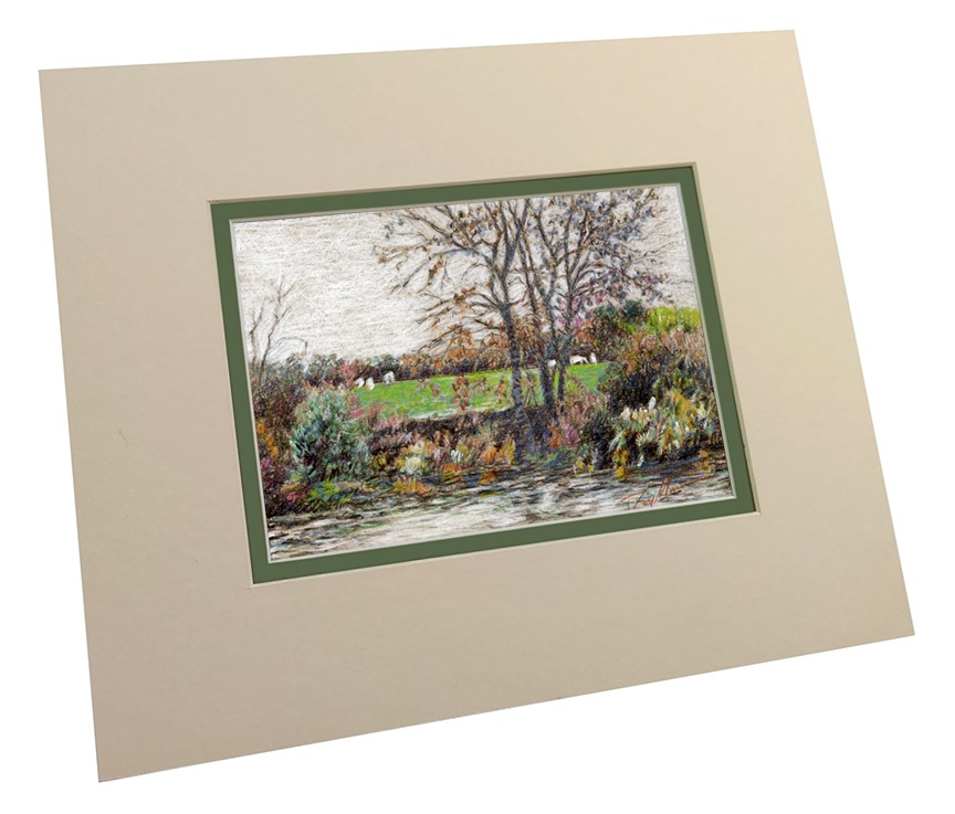 A small river can be very relaxing, especially if there are a few cattle grazing in the distance in a pasture on the opposite bank. This pencil drawing is a preliminary sketch for a possible painting. A quick colored pencil sketch is a great way to capture the moment, or key aspects, for later reference in the studio. But in this case, my sketch is not done so quickly; it's more "finished," which allows me to better understand how I might best approach the painting.Backed with a heavy illustration board, the painting is not framed, but it includes a double mat, The larger (front) mat is a tan color and the inner mat is a grass green. Both mats have white beveled edges. See photo.