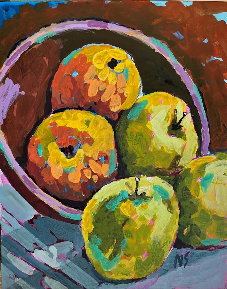 This is a colorful acrylic still life of apples painted on a DaVinci pro panel 10 x 8 that has a 1 5/8 inch painted black edge. It has been varnished with a protective coat and framing hardware is attached. No frame is needed. This paining has been inspired by a class, Fresh Paint, taught by Ali Kay. This is a colorful acrylic still life of apples painted on a DaVinci pro panel 10 x 8 that has a 1 5/8 inch painted black edge. It has been varnished with a protective coat and framing hardware is attached. No frame is needed. This paining has been inspired by a class, Fresh Paint, taught by Ali Kay. |