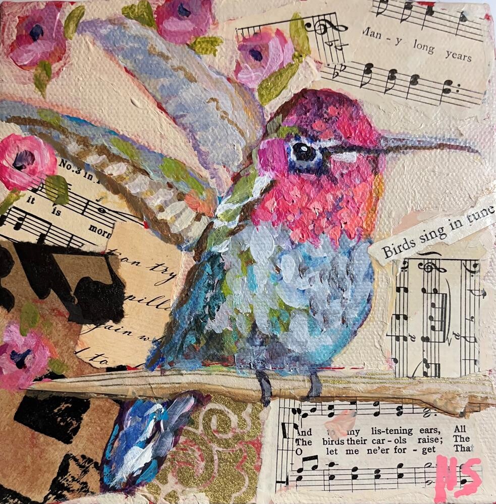 This is a small 6 x 6" gallery wrapped canvas painted with acrylics with some collage pieces. They one and a half inch edge is painted gray. The title comes from a piece of vintage paper in the painting taken from a story book that said birds sing in tune. The painting was inspired by a photo taken from, the site paint my photo by JanRuss. This is a small 6 x 6" gallery wrapped canvas painted with acrylics with some collage pieces. They one and a half inch edge is painted gray. The title comes from a piece of vintage paper in the painting taken from a story book that said birds sing in tune. The painting was inspired by a photo taken from, the site paint my photo by JanRuss. |