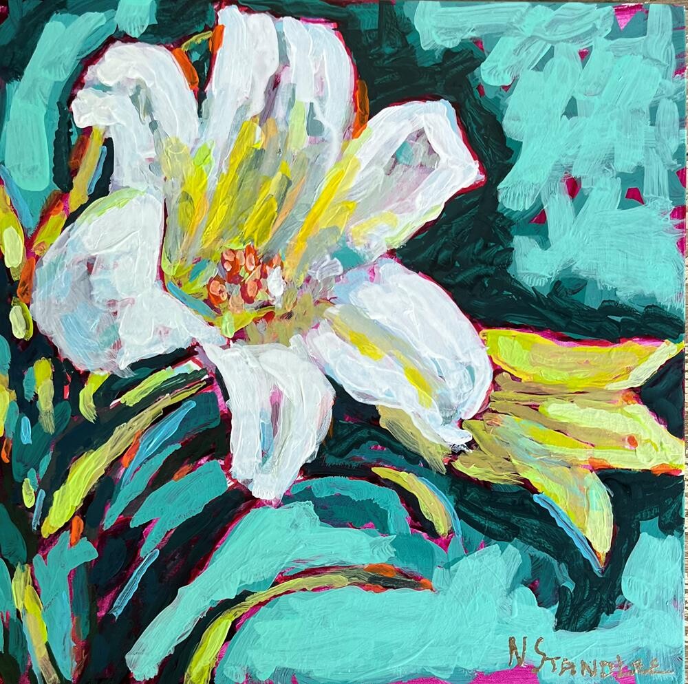 This floral is painted in bold acrylic colors and it is from an online class offered by Ali Kay. After enjoying painting in her style in the free zinnia class, I have decided to take her online class for the next year. She uses Golden fluid paints and has a unique style and her color sense is appealing to me. This is painted on a 8x8 DaVinci pro panel, medium texture made from New Zealand pine. The cradle is 7/8" thickness, painted black and is ready to hang. This floral is painted in bold acrylic colors and it is from an online class offered by Ali Kay. After enjoying painting in her style in the free zinnia class, I have decided to take her online class for the next year. She uses Golden fluid paints and has a unique style and her color sense is appealing to me. This is painted on a 8x8 DaVinci pro panel, medium texture made from New Zealand pine. The cradle is 7/8" thickness, painted black and is ready to hang. |
