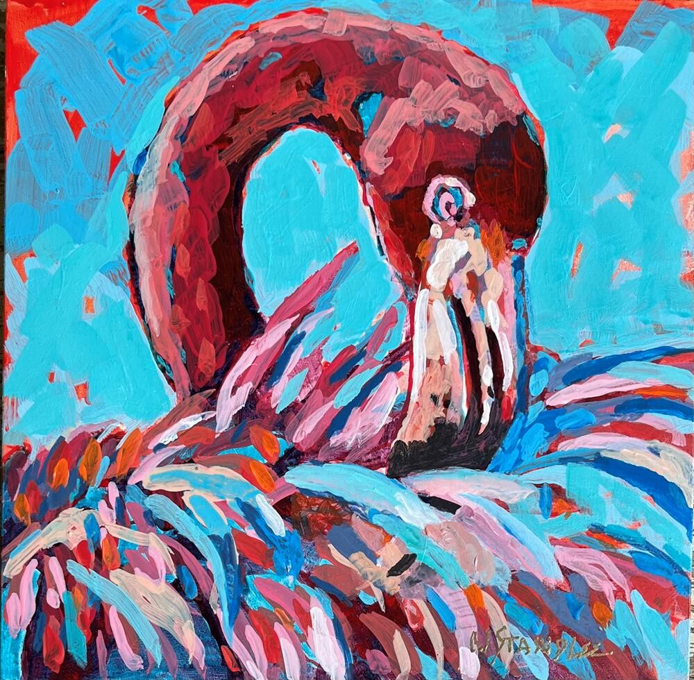 This bird, flamingo, is painted in bold acrylic colors and it is from an online class offered by Ali Kay. After enjoying painting in her style in the free zinnia class, I have decided to take her online class for the next year. She uses Golden fluid paints and has a unique style and her color sense is appealing to me. This is painted on a 8x8 DaVinci pro panel, medium texture made from New Zealand pine. The cradle is 7/8" thickness, painted black and is ready to hang. This bird, flamingo, is painted in bold acrylic colors and it is from an online class offered by Ali Kay. After enjoying painting in her style in the free zinnia class, I have decided to take her online class for the next year. She uses Golden fluid paints and has a unique style and her color sense is appealing to me. This is painted on a 8x8 DaVinci pro panel, medium texture made from New Zealand pine. The cradle is 7/8" thickness, painted black and is ready to hang. |