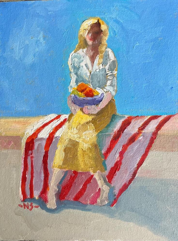 This is the second painting I have done of this girl, holding a fruit bowl. The other one is framed and has a slightly different coloring. This is painted in oil and it is not framed. It is painted on a Raymar medium texture panel. This is the second painting I have done of this girl, holding a fruit bowl. The other one is framed and has a slightly different coloring. This is painted in oil and it is not framed. It is painted on a Raymar medium texture panel. |