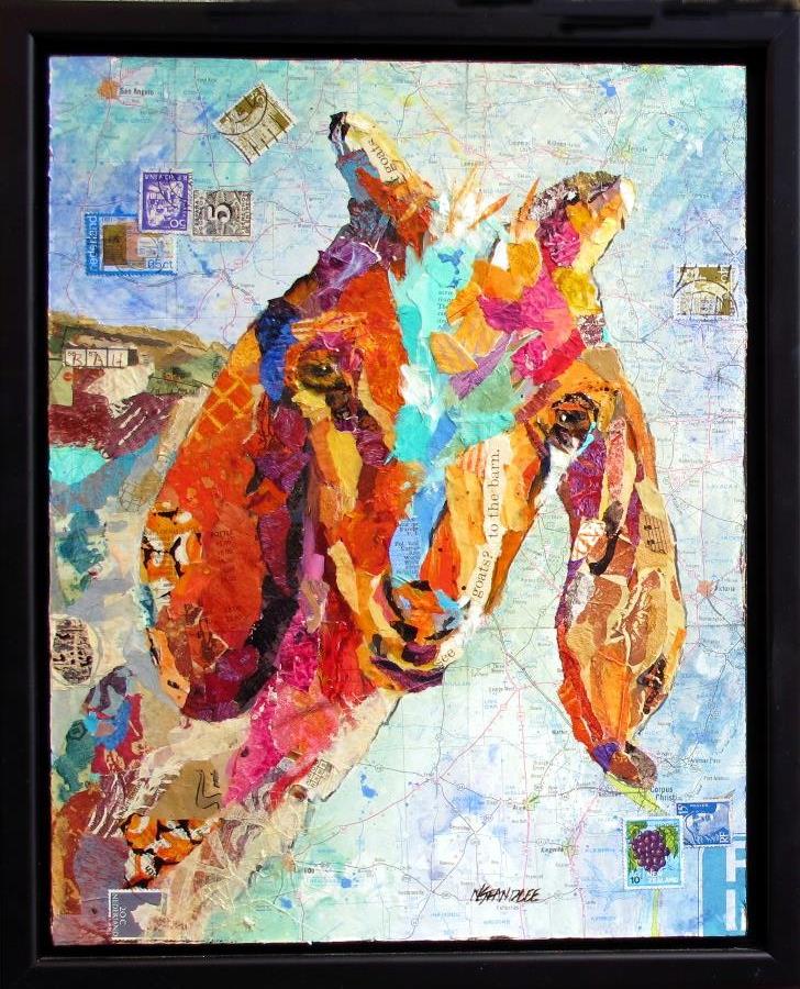Goat collage with hand painted paper on a TX map background showing cities San Angelo, Kingsville, Laredo, Mason, Lampasas, Temple,Corpus Christi, framed in a black floater frame Goat collage with hand painted paper on a TX map background showing cities San Angelo, Kingsville, Laredo, Mason, Lampasas, Temple,Corpus Christi, framed in a black floater frame |