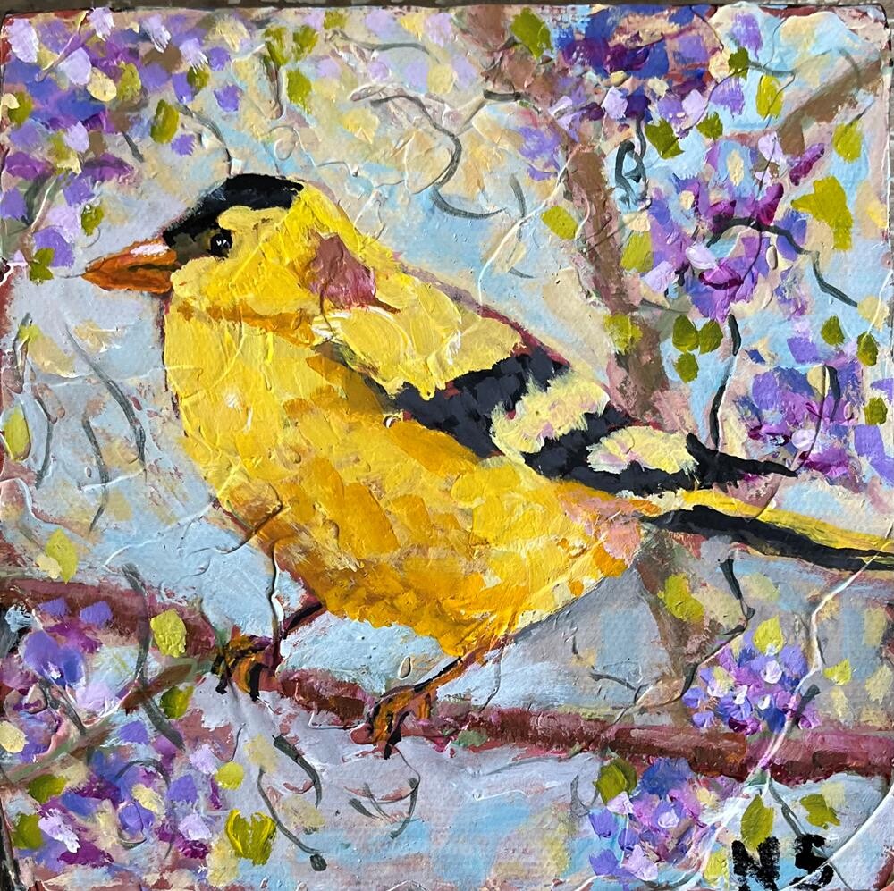 This goldfinch is painted in acrylic on a 6 x 6 x 1 1/2" depth gallery, wrapped canvas. If you are interested in buying it, there is a form on Daily Paintworks to send an email. This bird acrylic painting is on a gallery wrapped canvas that is 1.5" inch deep and the edge is painted black. It is inspired by an online class Ive recently taken from Acrylic University taught by Dianna Shyne. We were asked not to post the price of any of our works that we have painted in class but if someone is interested, they can email me and I will give them the price of the work and make the arrangements for the sale. I will post the quoted price on DPW and shipping. (Similar sizes have similar prices)