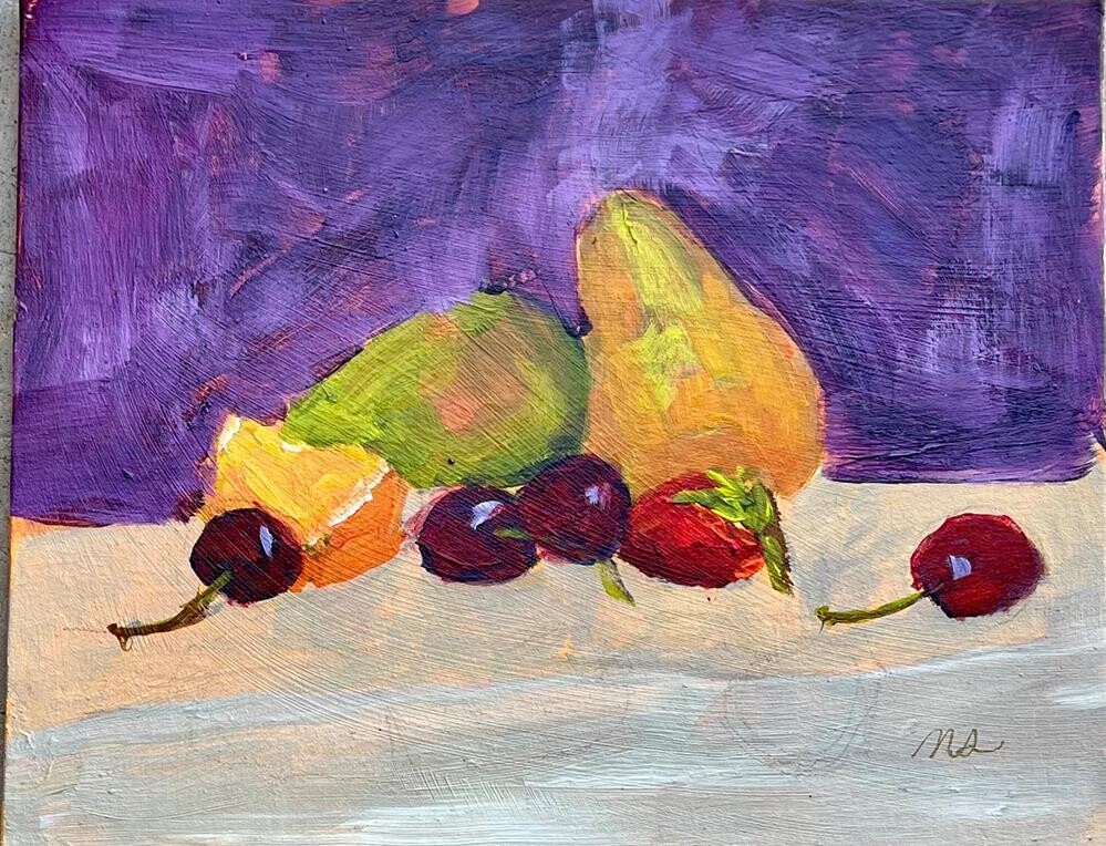 An acrylic still life with pears and fruit. It is painted on a panel and would need to be framed.