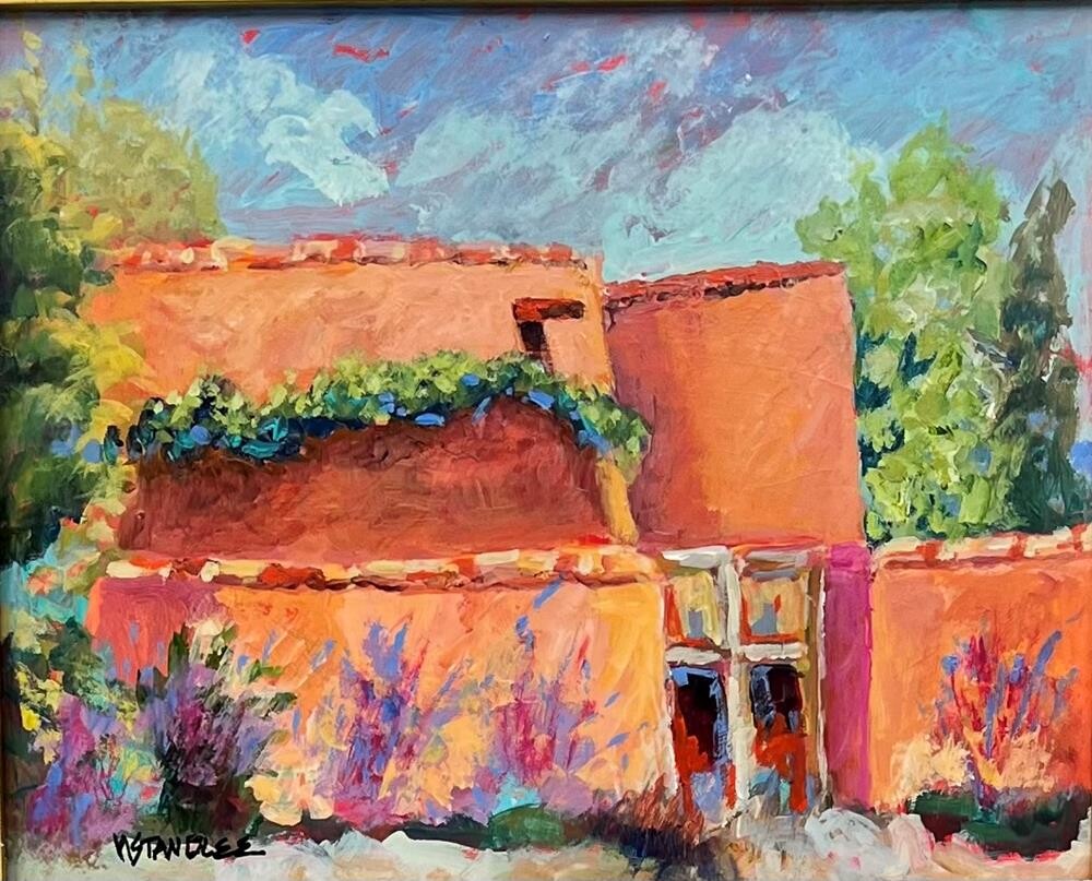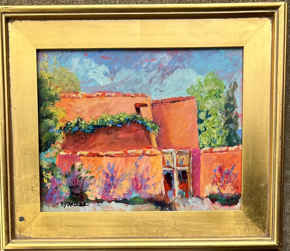 "Santa Fe Adobe" was painted in plein air in New Mexico in August.Framed in a 3" gold leaf frame. "Santa Fe Adobe" was painted in plein air in New Mexico in August.Framed in a 3" gold leaf frame. |
