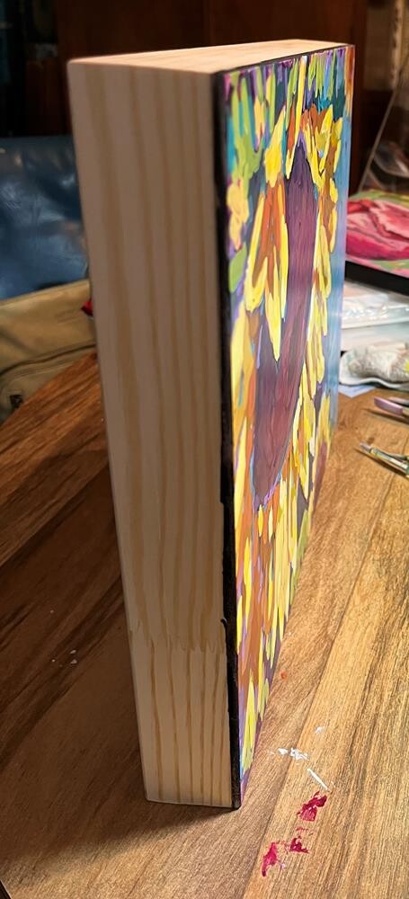 This acrylic sunflower paining is 11 x 14 x 1 5/8“, painted on a DaVinci pro panel. The sides are left natural and there has been a protective varnish added. No frame is necessary and it has hardware ready to hang. This acrylic sunflower paining is 11 x 14 x 1 5/8“, painted on a DaVinci pro panel. The sides are left natural and there has been a protective varnish added. No frame is necessary and it has hardware ready to hang. |