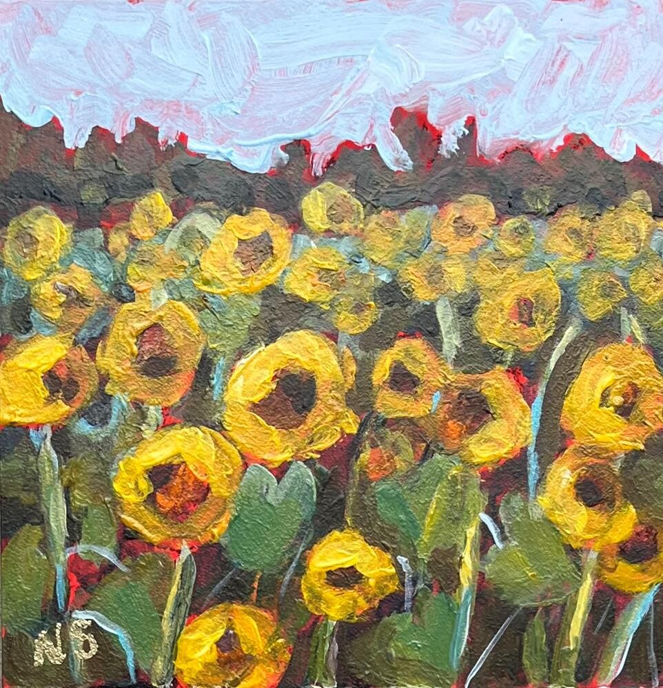I have been taking a landscape course by Melanie Morris and this sunflower field has been inspired by one of the classes. It is painted in acrylic on gessoboard on a panel and will need to be framed or it could be set up on a small easel on display. The photo I used came from a site called paint my photo and the photographer is Rita Morgan. .