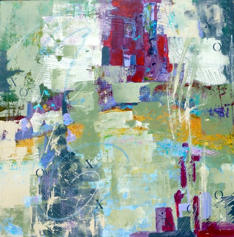 This 30x30" mixed media abstract is painted on a gallery wrapped textured canvas with 1 1/2" depth sides painted in a gray with micaceous iron oxide (gives it a few glimmers). It is signed on the side so it could be turned for a different orientation.