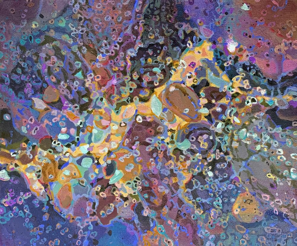 Pattern Series: Is it a creek bed? a fissure in the earth, or sky? Is it particles coming together, or breaking apart? Painted in rich tones of Indigo, Violet and turquoise, this is a very alive and vibrant painting.
