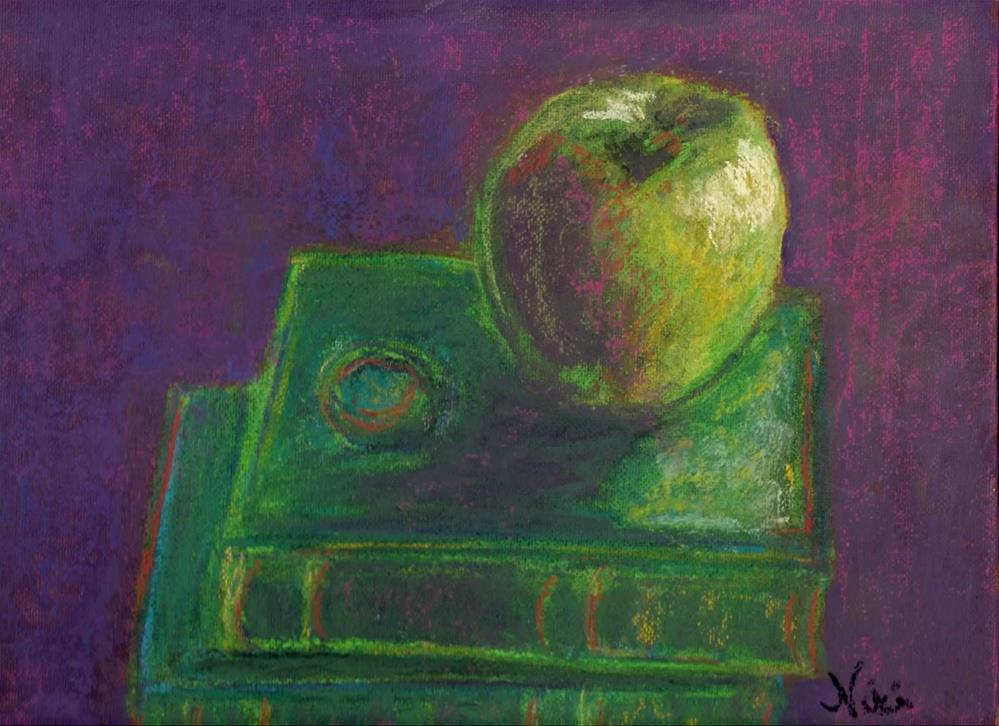 Painted with soft pastels on flat canvas, this still life features a couple of antique encyclopedias from the 1930's (they are quite tiny!) and a green apple, inspired by my years as a teacher.