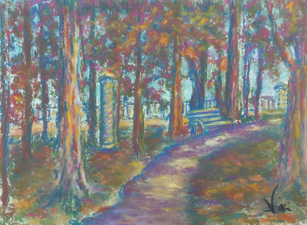 9 x 12 soft pastel on watercolor-toned paper, an impressionistic view of autumn trees and a path Price includes USPS First Class shipping-- piece comes carefully packaged with Glassine paper cover to protect artwork until you are ready to frame it under glass. 9 x 12 soft pastel on watercolor-toned paper, an impressionistic view of autumn trees and a path Price includes USPS First Class shipping-- piece comes carefully packaged with Glassine paper cover to protect artwork until you are ready to frame it under glass. |