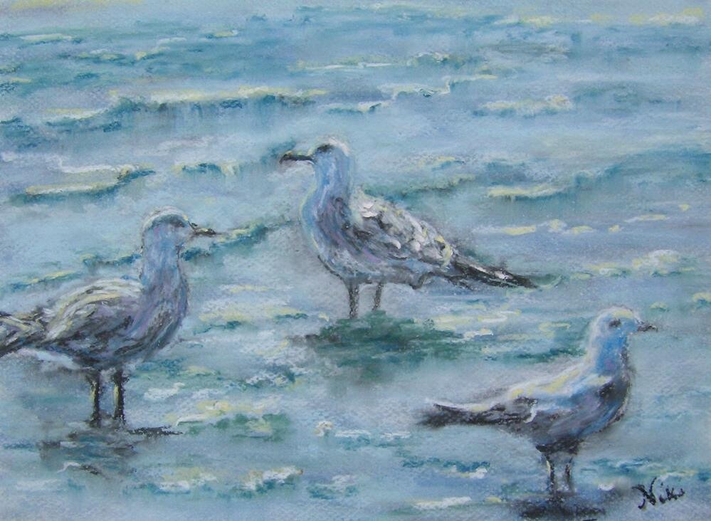 Soft pastel on Canson Mi-Teintes paper Seagulls wading in the sparkling afternoon waves at the beach in Oceanside, California Price includes free USPS First Class shipping. Piece comes carefully packaged with Glassine paper cover to protect artwork until you are ready to frame it under glass.