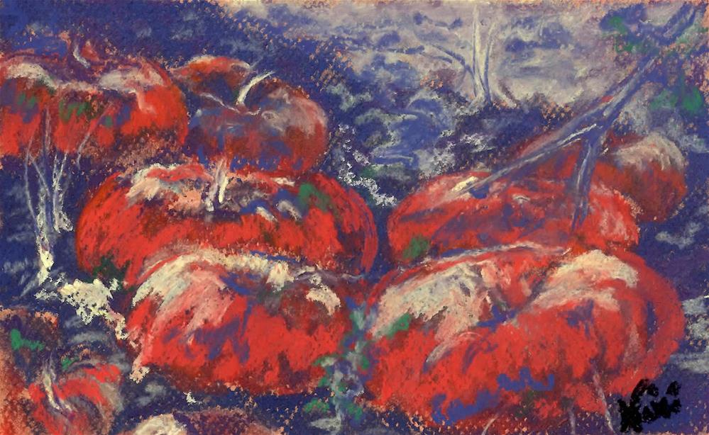 Created with pastel on Canson Mi-Teintes paper, this autumn pastel painting features a collection of pumpkins past their prime-- but still beautiful-- at a local pumpkin patch.