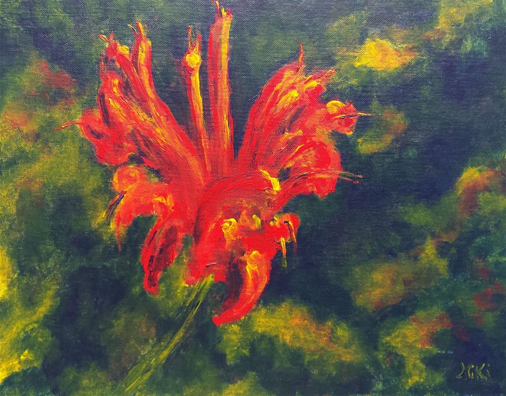 This painting was created by using a palette of ultramarine blue, cadmium yellow, and cadmium red to mix the colors for the flower and background. I'm not sure what these flowers are called, but they pop up in the spring with a burst of red and attract plenty of birds.