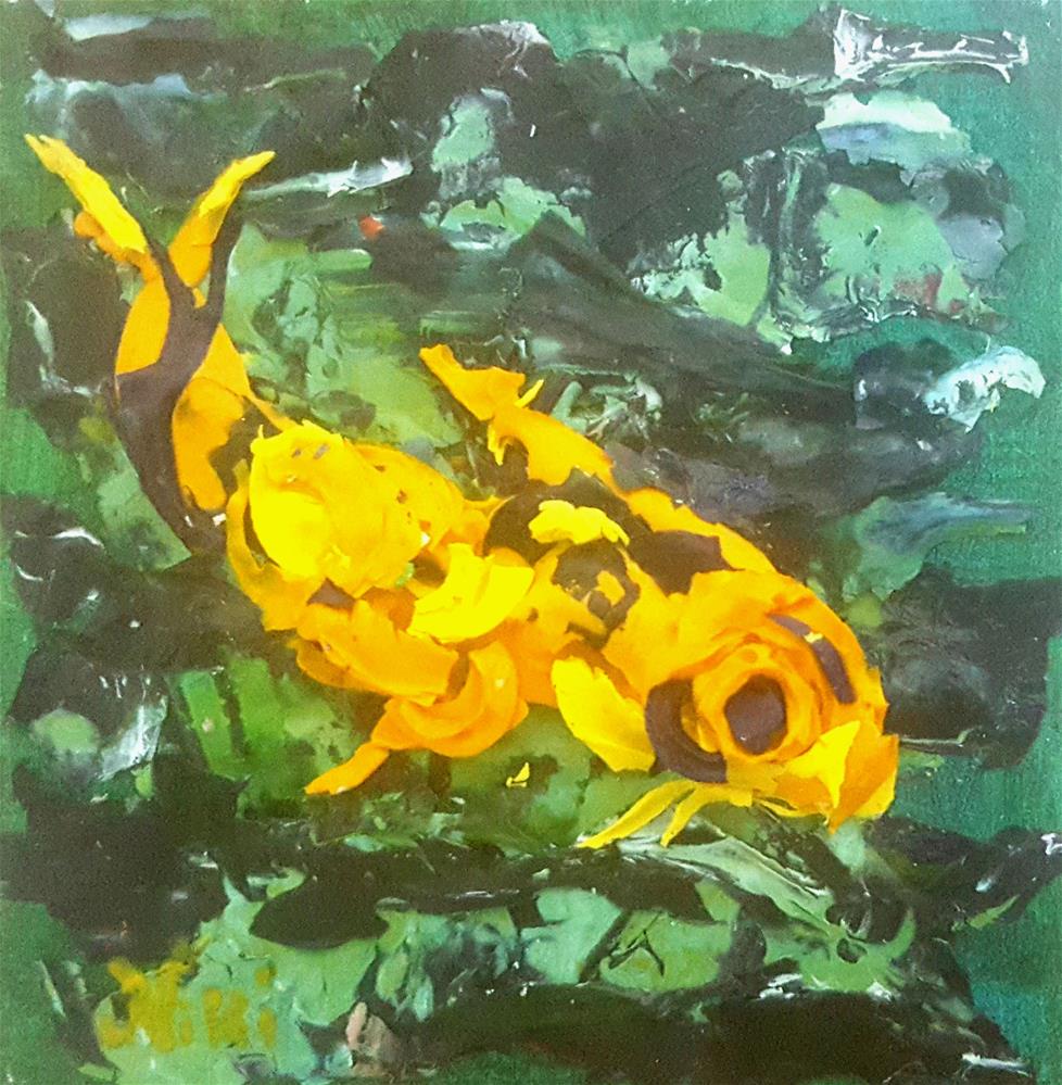 Assembled with acrylic paint skins from the palette and matte medium on a miniature flat canvas, this unique aquatic painting was inspired by the colorful fish you might find in a koi pond or tropical waters.