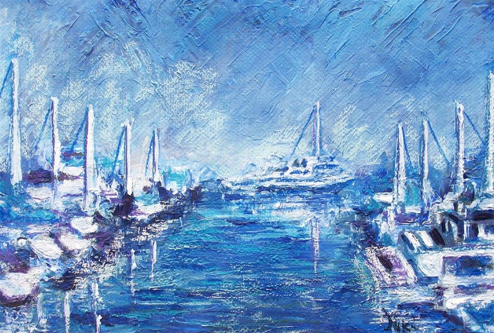 Created with an acrylic palette knife painting layered over with pastel, this heavily textured painting of a row of boats in Oceanside Harbor was inspired by our many walks among the boats on bright summer days.
