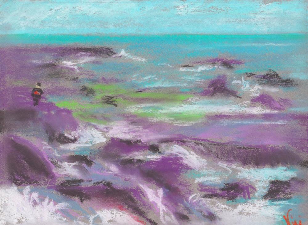 Inspired by a photo I took at Aliso Creek Beach in California, this painting features a lone figure walking along the rocks painted with soft pastels on Canson Mi-Teintes paper.
