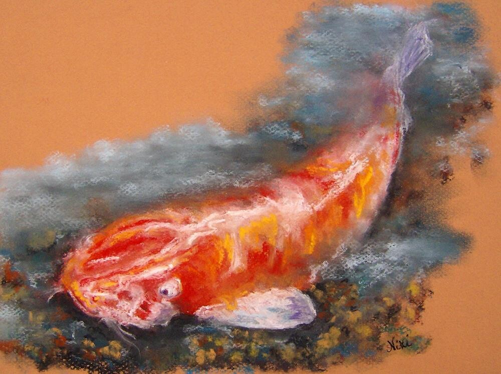 Close-up of a majestic koi fish in a garden pond, painted with soft pastels on Canson Mi-Teintes paper Price includes free USPS First Class shipping Close-up of a majestic koi fish in a garden pond, painted with soft pastels on Canson Mi-Teintes paper Price includes free USPS First Class shipping |