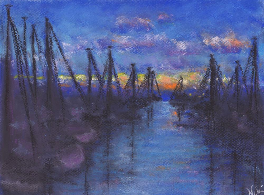 Created with soft pastels on blue-toned Canson Mi-Teintes paper, this impressionistic nautical scene features the soft light typical of sunset at the harbor in Oceanside, California.
