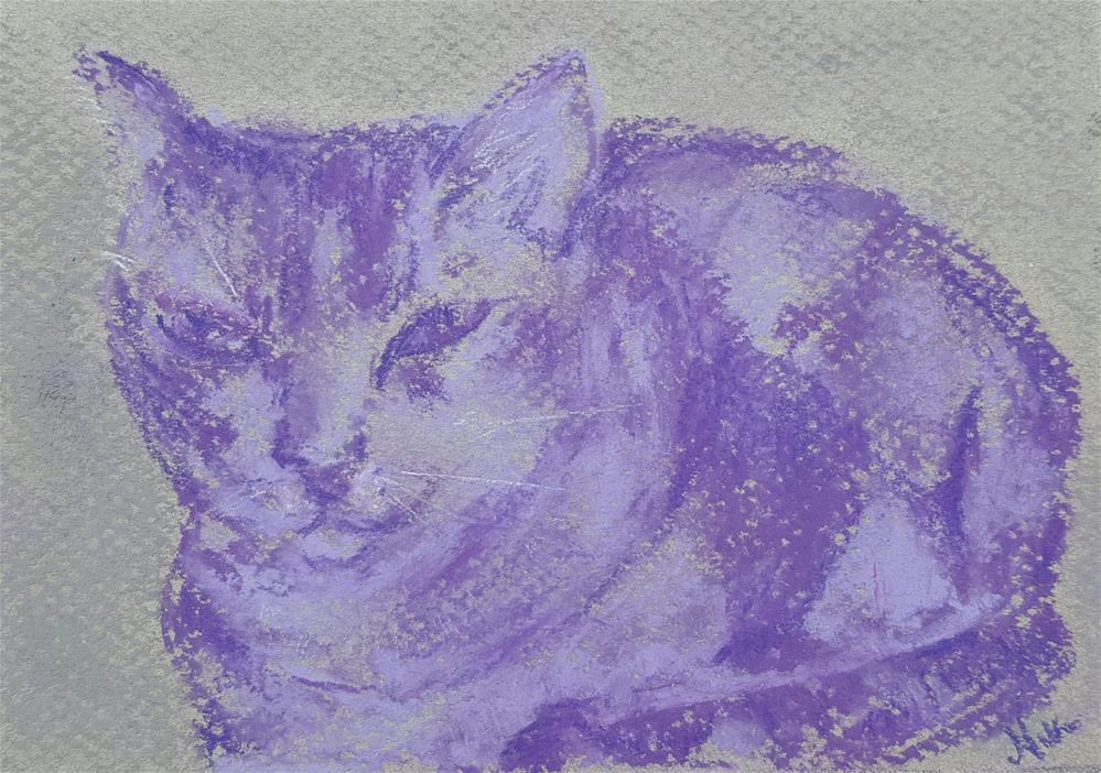 Small, impressionistic cat sketched with purple Pastel tones on Canson Mi-Teintes paper