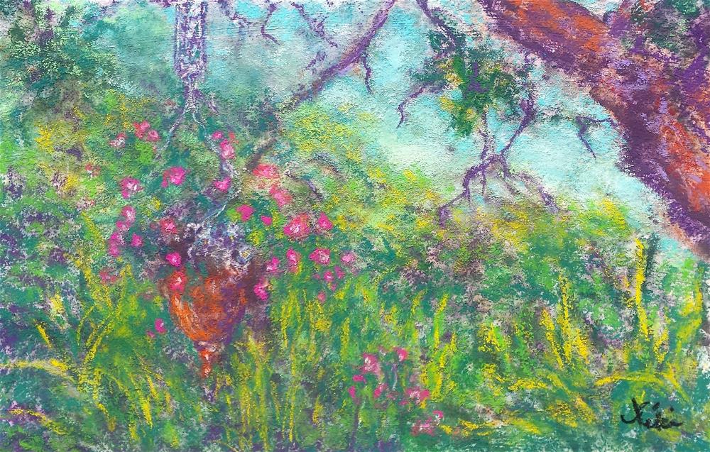Created with layers of wet and dry pastel on watercolor paper textured with gesso, this impressionistic painting was inspired by a delightful hanging bouquet in a local garden.