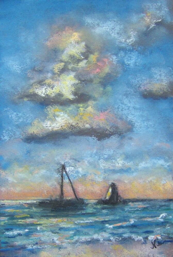 Soft pastel on dark gray Canson Mi-Teintes paper Inspired by a couple of boats out on the horizon as the sun sets in Oceanside, California Price includes free USPS First Class shipping. Piece comes carefully packaged with Glassine paper cover to protect artwork until you are ready to frame it under glass. Soft pastel on dark gray Canson Mi-Teintes paper Inspired by a couple of boats out on the horizon as the sun sets in Oceanside, California Price includes free USPS First Class shipping. Piece comes carefully packaged with Glassine paper cover to protect artwork until you are ready to frame it under glass. |