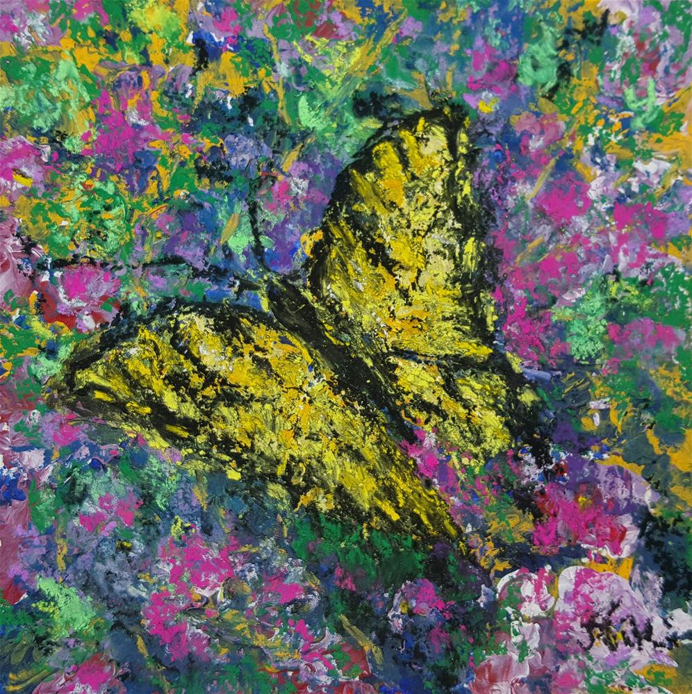 Created with an acrylic palette knife painting layered over with pastel (on thick watercolor paper), this heavily textured piece was inspired by a large butterfly hovering over the flowers on Easter.